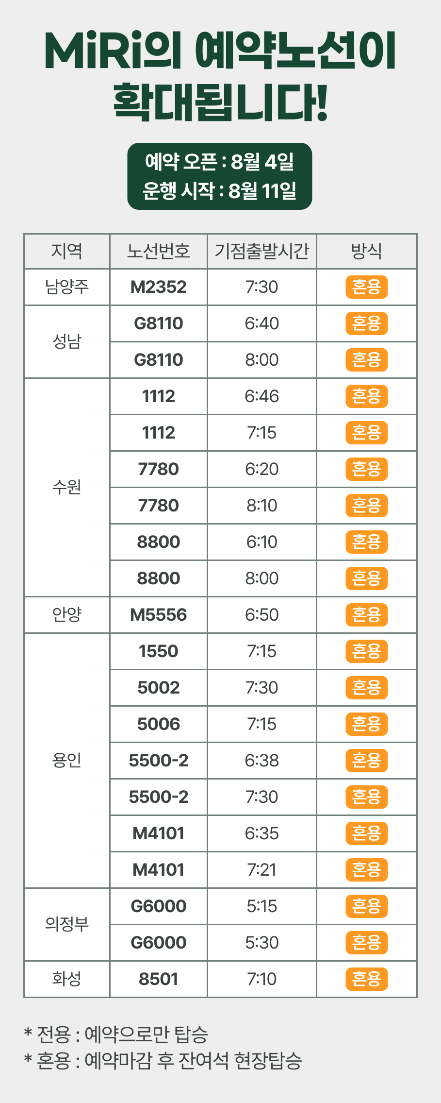 - 스마트폰 앱(MiRi 앱)을 통해 사전에 좌석을 예약하고, 정해진 시간에 정류소에서 대기 없이 바로 탑승할 수 있는 서비스