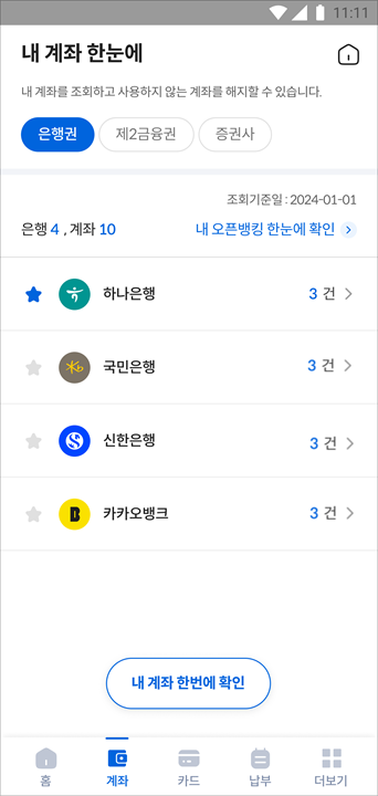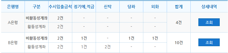 - “계좌내역 조회” 화면에서 본인의 보유계좌수를 기관별, 계좌 활성 여부별, 상품유형별로 구분하여 한눈에 조회할 수 있습니다.