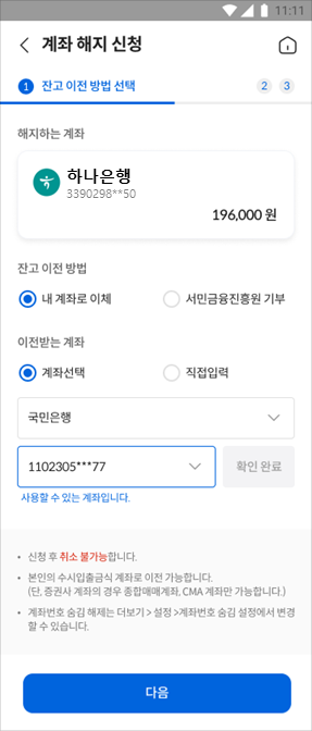 ➍ < 잔고이전·해지 > (출처: 금융위원회 보도자료) - 잔고이전 시 계좌 잔액은 본인 명의 수시입출금식 계좌에 잔고이전, 또는 서민금융진흥원 기부 中 선택할 수 있습니다.