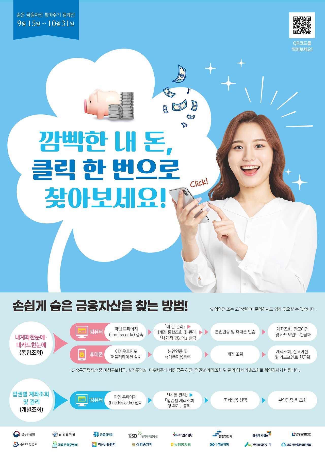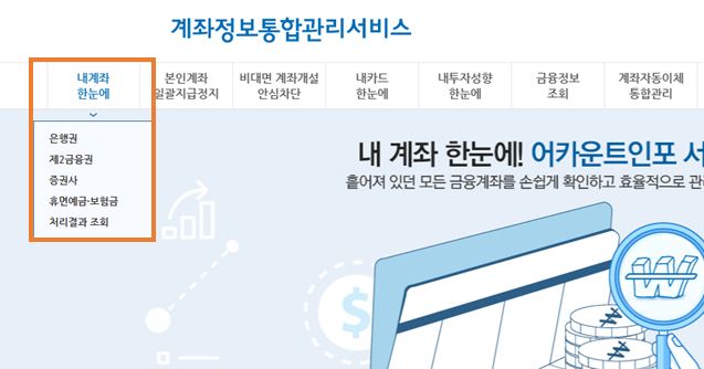 - 공식 서비스 ‘파인’(금감원 금융소비자정보포털)을 통한 ‘내 계좌 통합조회 및 관리’를 이용하면 클릭 몇 번으로 내 숨은 금융자산을 한눈에 확인할 수 있어요.