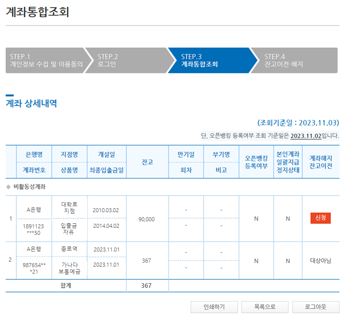 ➋ < 금융기관별 계좌내역 조회 > (출처: 금융위원회 보도자료) - 계좌별 세부내역을 확인하고, 해지를 원하는 100만 원 이하 비활동성 계좌(1년 이상 거래내역 없는 계좌)에 대해 “계좌해지신청”을 합니다.